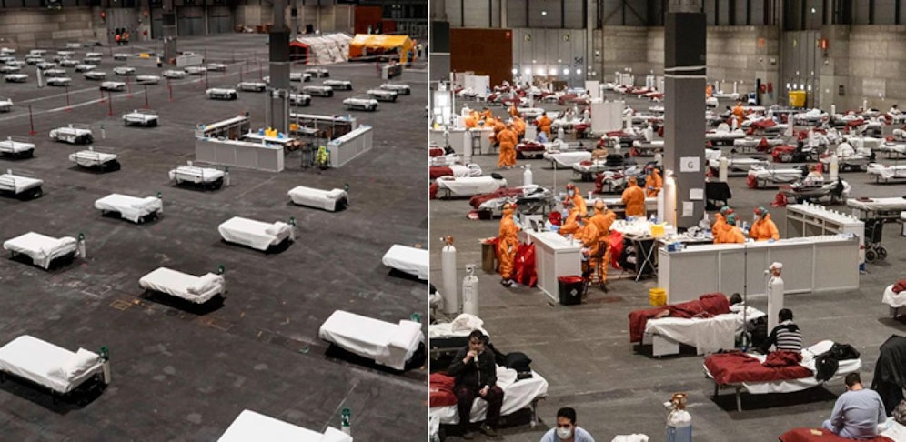 Die Spitäler in Spanien sind überfüllt - jetzt gibt es landesweit Ausweichquartiere - ähnlich wie das Messegelände "Ifema" in Madrid. Vor Wochen wurde es bereits hergerichtet, nun ist es mit Corona-Patienten voll belegt, wie die Bilder zeigen.