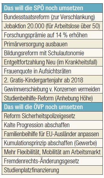Sieben Projekte möchte die ÖVP noch abschließen. Dazu gehören die Anpassung der Familienbeihilfe für EU-Ausländer, das Fremdenrechts-Änderungsgesetz und die Reform des Sicherheitspolizeigesetzes.