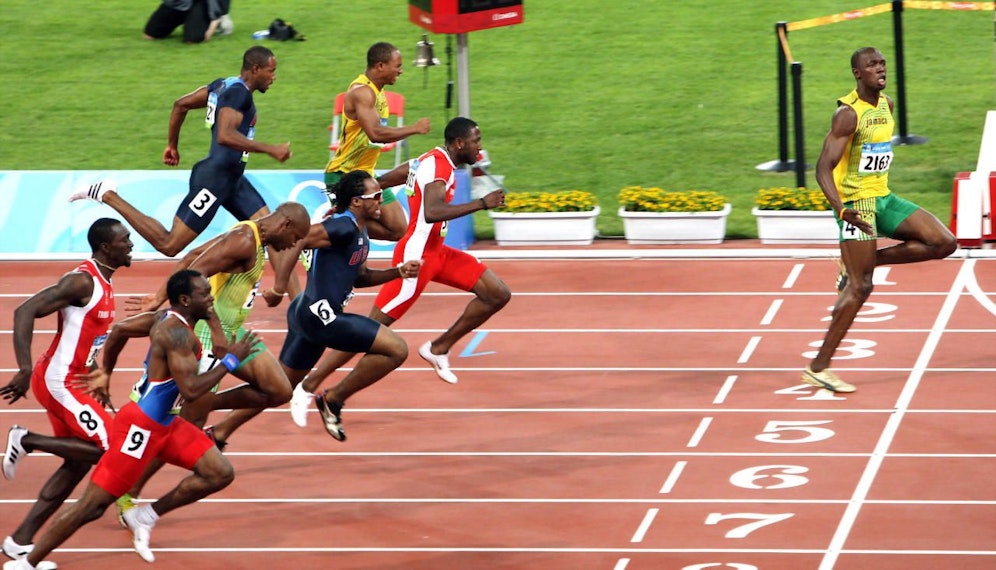 Es ist das Zielfoto von Bolts genialem 100-Meter-Olympia-Goldlauf 2008 in Peking. Er betitelt es mit "Social Distancing". Seht selbst: