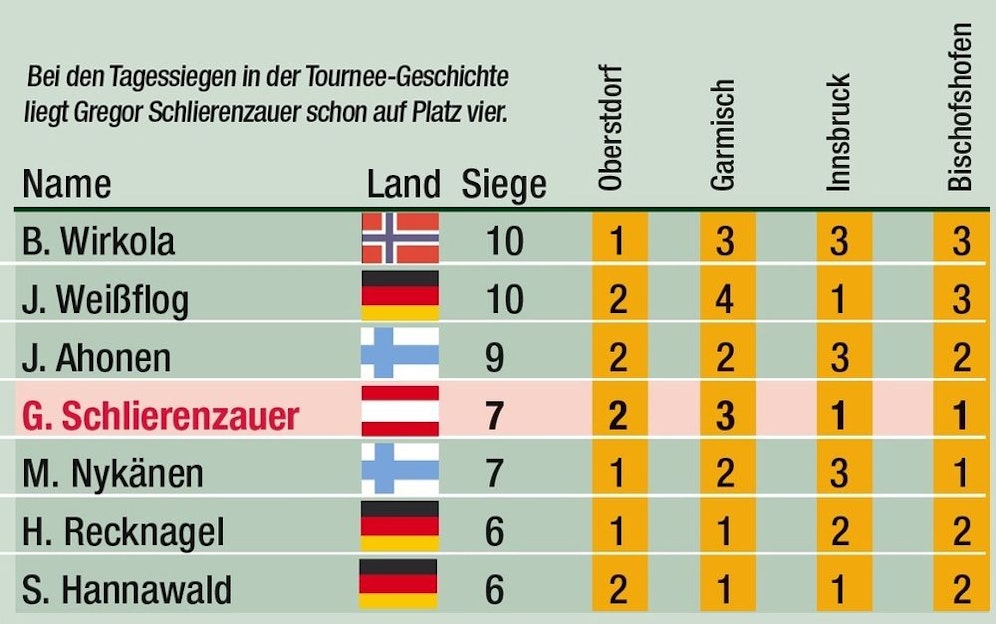 Die ewige Bestenliste der Tournee-Tagessieger: