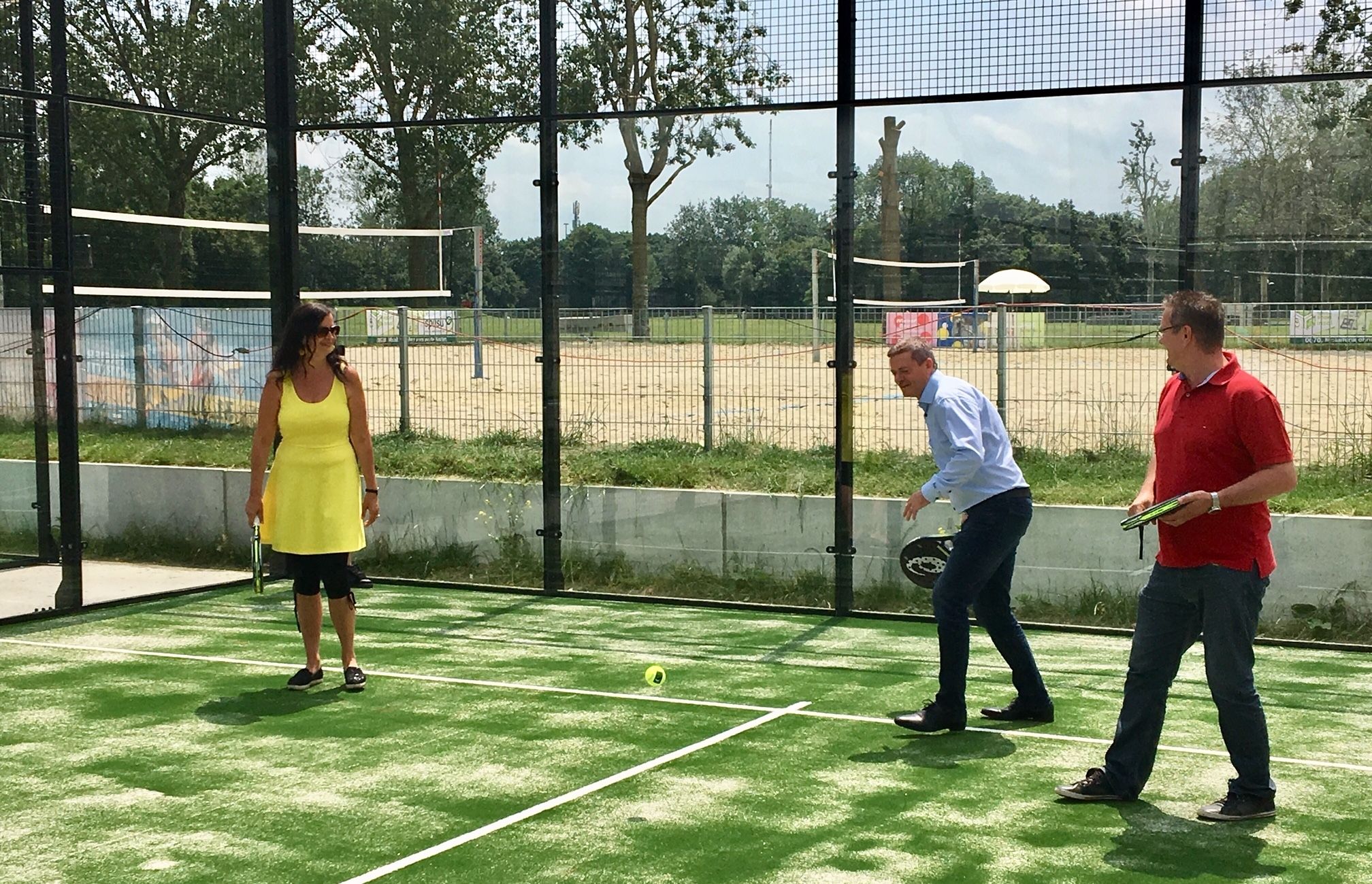 Umweltstadträtin Ulli Sima, spusu-Geschäftsführer Franz Pichler und der Floridsdorfer Bezirksvorsteher Georg Papai (v.l.n.r.) versuchten sich im Padel-Tennis: