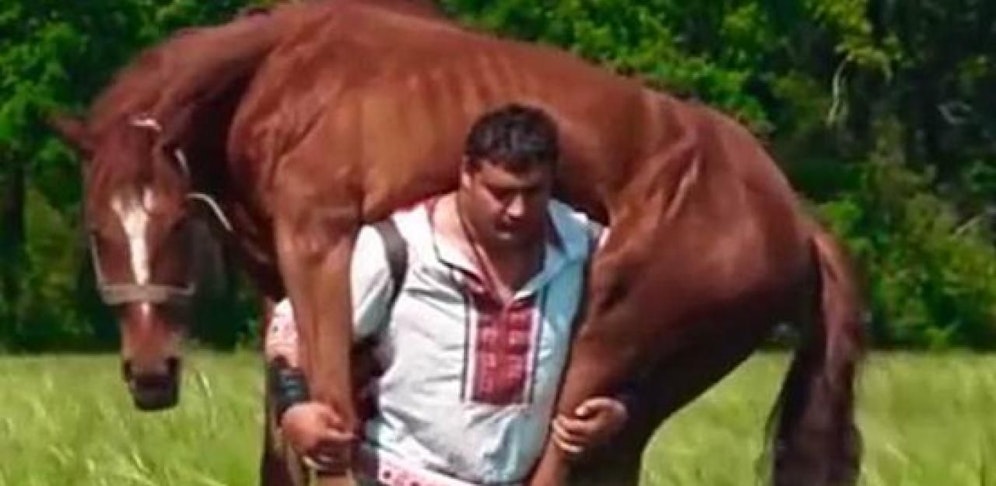 Strongman-Training der anderen Art. Dmitri Khaladzhi gilt als stärkster Mann der Welt. Sein neuester Coup: Pferde tragen! Die Rund 450 kg schweren Vierbeiner werden vom Ukrainer locker geschultert. Mit einer Holzplatte auf dem Rücken bewegt der 38-Jährige diese Lasten scheinbar mühelos.