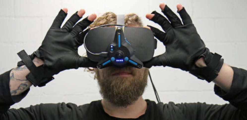Dass man die eigenen Hände mit in den Cyberspace nehmen kann, ist einem guten Dutzend Sensoren zu verdanken. Diese stecken in den Handschuhen, etwa auf der Handoberfläche. Sie erfassen sehr genau, wenn man die Finger bewegt, und transferieren dies dann in die virtuelle Realität über einen Adapter, der auf der VR-Brille sitzt.