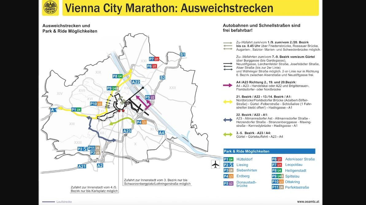 Wer aus dem Zentrum Richtung Südosttangente (A23) möchte, kann erst ab ca. 11:45 Uhr wieder ausfahren. Route: Franz-Josefs-Kai → Uraniastraße → Dampfschiffstraße → Weißgerberlände → Erdberger Lände. Diese Achse wird erst freigegeben, wenn der Marathonbereich in der Innenstadt teilweise passiert ist.