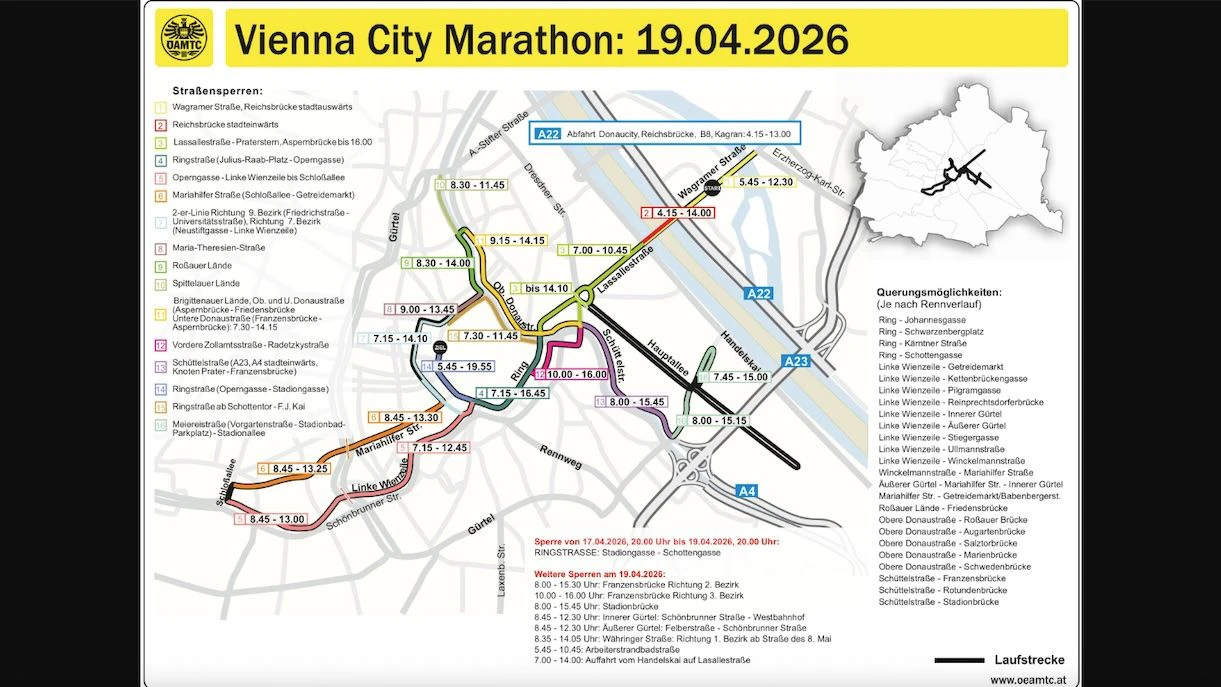 Am Sonntag, 19. April 2026, verwandelt der Vienna City Marathon (VCM) Wien erneut in eine große Laufstrecke. Für Autofahrer bedeutet das: zahlreiche Sperren, Umleitungen und eingeschränkte Zufahrten in vielen Bezirken. Der ÖAMTC warnt vor erheblichen Verkehrsbehinderungen – besonders im innerstädtischen Bereich.