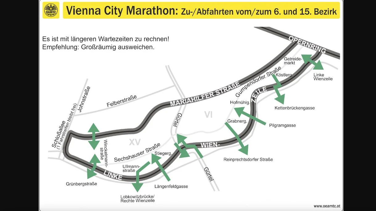 Zwischen 08:30 und ca. 13:30 Uhr wird es hier besonders schwierig. Grund: Die Marathonstrecke führt über die Linke Wienzeile (Hinweg) und die Mariahilfer Straße (Rückweg).