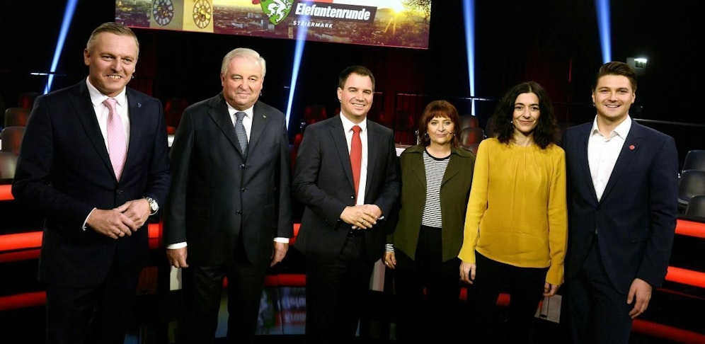 Die Spitzenkandidaten bei der Steiermark-Wahl: (v.l.) Mario Kunasek (FPÖ), Hermann Schützenhöfer (ÖVP), Michael Schickhofer (SPÖ), Claudia Klimt-Weithaler (KPÖ), Sandra Krautwaschl (Grüne) und Niko Swatek (Neos)