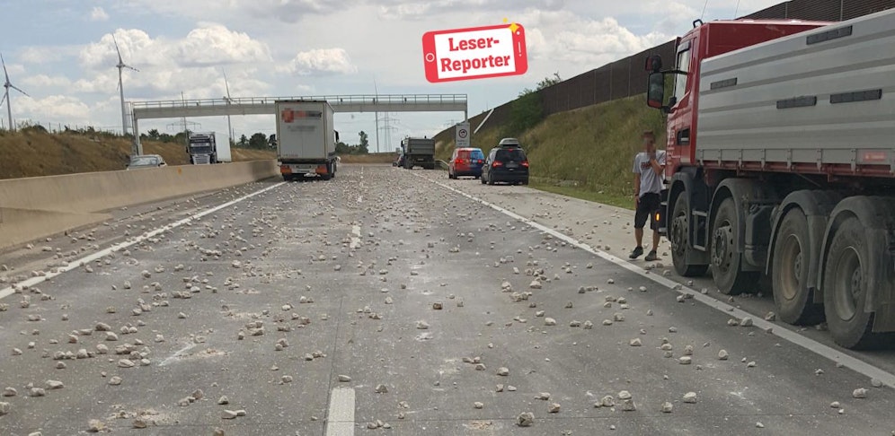 Am Mittwoch gegen 13 Uhr hat ein Lkw auf der S1 in Richtung Wien sein Ladegut verloren. Wie Fotos von Leserreporter Roman H. zeigen, verteilte das Fahrzeug Tausende Steinbrocken auf der Fahrbahn.