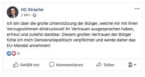 In den sozialen Medien tauchte kurz nach 17 Uhr ein Screenshot eines Facebook-Postings auf, das genau das suggeriert. "Ich bin über die große Unterstützung der Bürger, welche mir mit ihren Vorzugsstimmen eindrucksvoll ihr Vertrauen ausgesprochen haben, erfreut und zutiefst dankbar. Diesem großen Vertrauen der Bürger fühle ich mich demokratiepolitisch verpflichtet und werde daher das EU-Mandat annehmen", soll Strache am frühen Nachmittag auf seiner persönlichen Facebook-Seite geschrieben haben. Der Beitrag dürfte mindestens 20 Minuten online gewesen sein, bevor er wieder von der Seite gelöscht wurde.