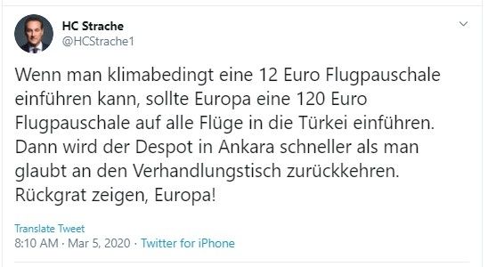 Statt Strafe nennt Strache es "Flugpauschale" und vergleicht es mit der geplanten 12 Euro-Flugticketabgabe für den Klimaschutz. Wenn man so etwas einführen könne, dann könne man auch diese Maßnahme gegen die Türkei machen.