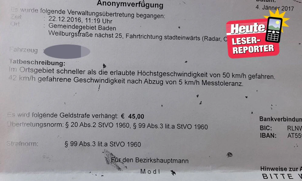 Ende Dezember war "Heute"-Leser Toni auf der Weilburgstraße im Gemeindegebiet Baden unterwegs. Als er in das Ortsgebiet mit einer 50er-Beschränkung fuhr, geriet er in eine Radarfalle. Bitte lächeln!