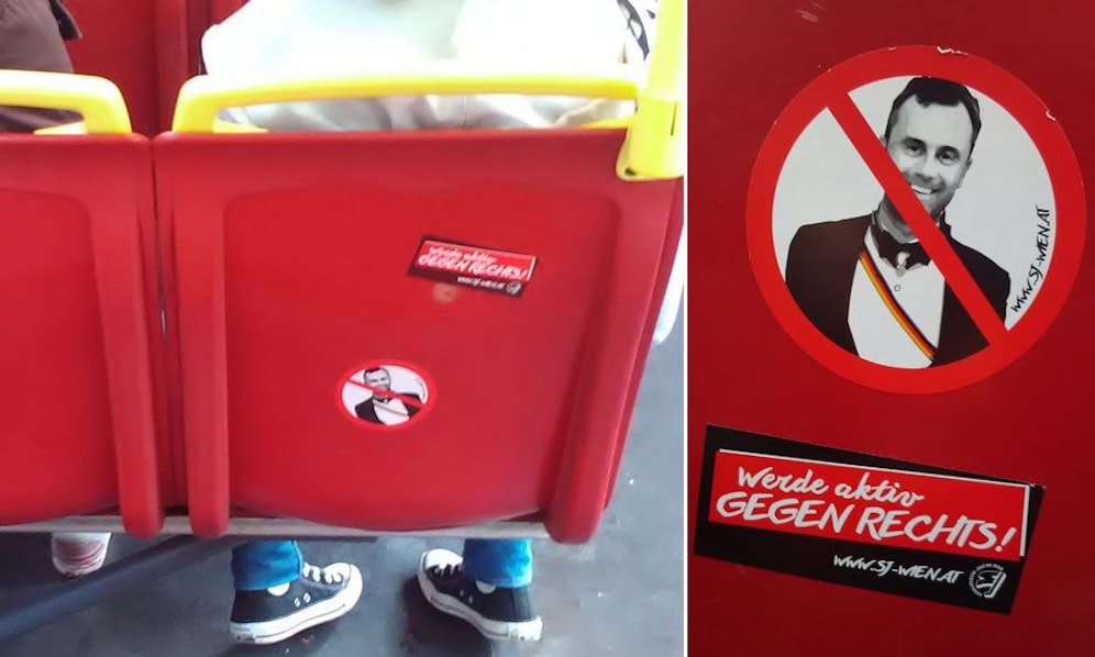 Leserreporter Franz Sedlaczek ist erbost: An allen Sitzen einer Garnitur der Straßenbahnlinie 10 klebten am Donnerstag zahlreiche Anti-Hofer-Pickerl der Sozialistischen Jugend Wien. Unser Leserreporter befürchtet, dass "die Reinigungskosten sich indirekt im Preis der Wiener Linien niederschlagen" werden.
