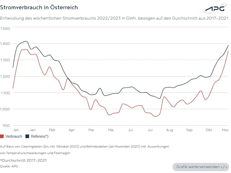 Die Daten zeigen auch eine Abnahme des Gesamtstromverbrauchs in Österreich. Verglichen mit dem Durchschnitt der Jahre 2017-2021 lag dieser November mit 6.022 GWh Verbrauch rund 7 Prozent unter dem Referenzwert. Dies sei vorwiegend auf die vermehrte Eigenproduktion bzw. den Eigenverbrauch durch Photovoltaik-Betreiber zurückzuführen, so APG. Daher könne der exakte Stromverbrauch Österreichs aktuell nicht genau verifiziert werden.