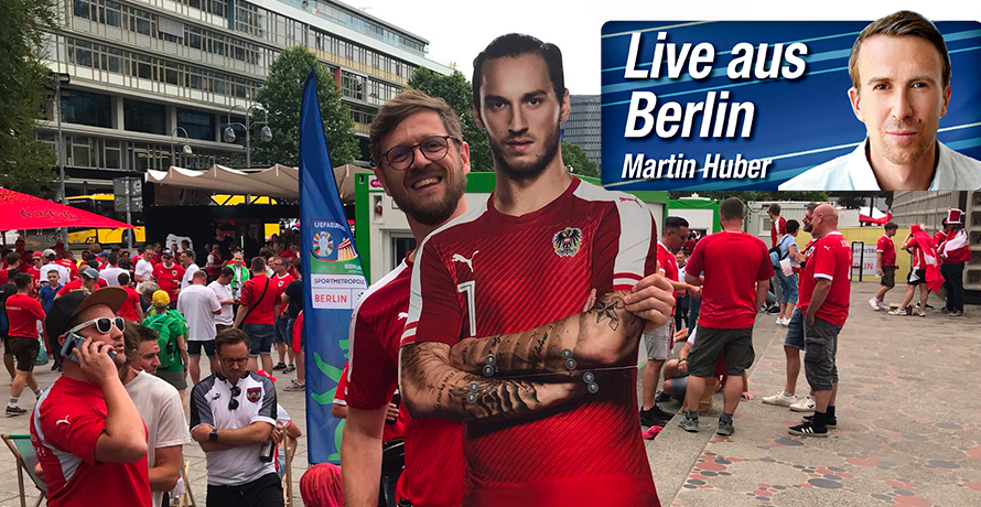 25.000 Österreich-Fans sind für das "Endspiel" in Berlin. Darunter ein ganz besonderer Fan. Christoph – ein gebürtiger Braunauer, der in Wien lebt – hat Marko Arnautovic als Papp-Begleitung auf seiner EM-Reise mit. "Der Marko war immer schon mein Lieblingsspieler. Darum war es klar, dass ich ihn mitnehme."