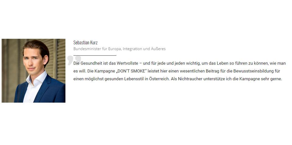 Ins Leben gerufen wurde die Petition von der von Ärzten und der Österreichischen Gesellschaft für Hämatologie & Medizinische Onkologie gegründeten Initiative "dontsmoke.at", die im Jahr 2015 übrigens noch den Bundeskanzler in spe, Sebastian Kurz, zu ihren prominenten Unterstützern zählen durfte. Der ÖVP-Chef befürwortet(e) die Kampagne, weil "sie einen wesentlichen Beitrag für die Bewusstseinsbildung für einen möglichst gesunden Lebensstil in Österreich leistet. Als Nichtraucher unterstütze ich die Kampagne sehr gerne."