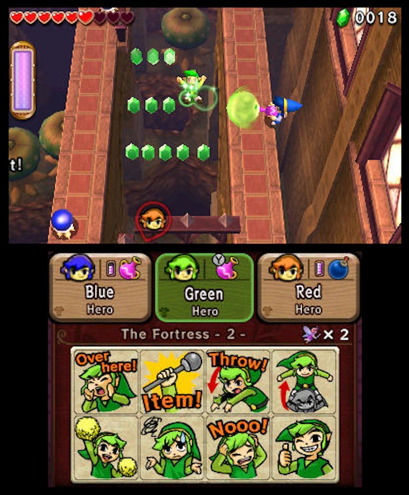 Soviel zur Geschichte, die etwas nach den Ereignissen von The Legend of Zelda: A Link Between Worlds angesetzt ist. Wie die Story schon beschreibt, soll Tri Force Heroes dabei aber kein reines Einzelspieler-Game, sondern ein Multiplayer-Spiel sein. Der 3DS-Zocker kann zwei Freunde mit ins Online-Abenteuer nehmen – ein mutiger Schritt von Nintendo im eigentlich klassischen Zelda-Singleplayer-Universum.