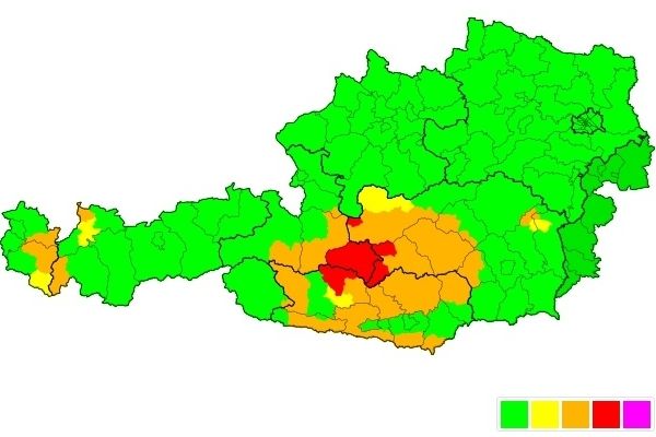 Die Schneefallgrenze schwankt dabei stark von Tal zu Tal, liegt aber meist zwischen 700 und 1000 Meter. Lokal kann es aber für kurze Zeit bei kräftigem Niederschlag bis in tiefe Lagen nasse Flocken geben. Vor allem in Oberkärnten und in der Obersteiermark sind so in höheren Tallagen in kurzer Zeit 5 bis 15 cm nasser Neuschnee zu erwarten. Auf den Bergen in Kärnten fallen teilweise 30 bis 40 cm Neuschnee in wenigen Stunden. Im Laufe des Nachmittags lässt der Niederschlag dann deutlich an Intensität nach.