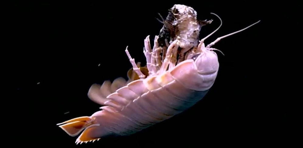 Eine knapp 20 Zentimeter lange Riesenassel fingen die Forscher mit ihrer Kamera ein. Das Tier machte sich gerade genüsslich über einen Fischkopf her.