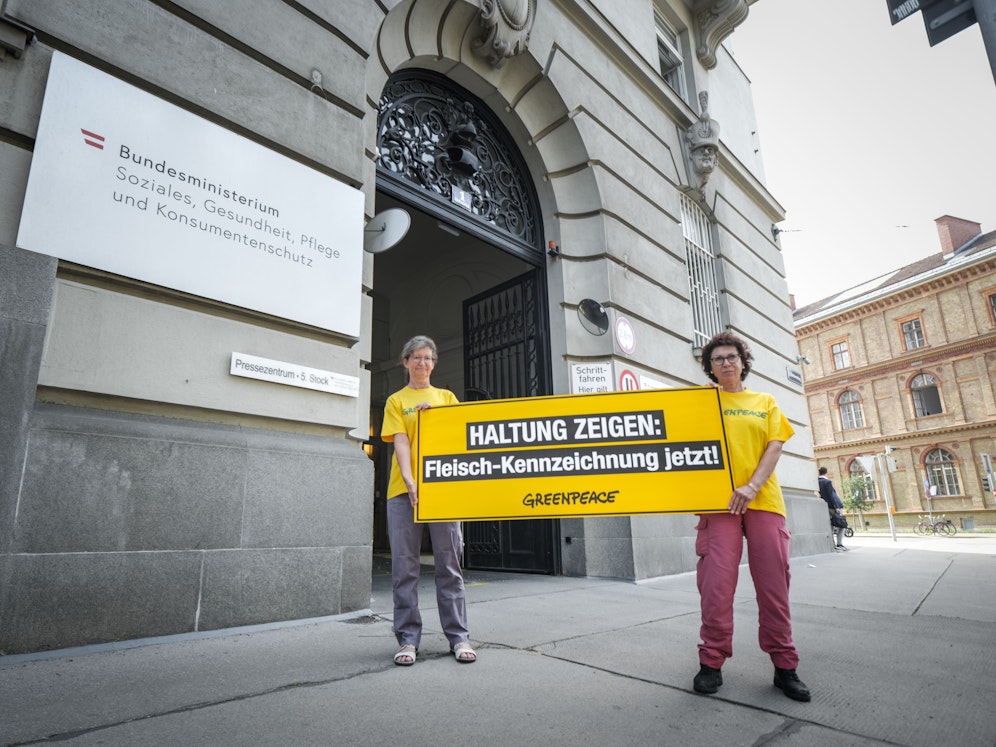 Vor dem Sozialministerium protestierten unterdessen Aktivistinnen und Aktivisten der Umweltschutzorganisation Greenpeace für die rasche Einführung eines Tierhaltungskennzeichens. Die Aktivisten kritisieren die mangelnde Transparenz bei Fleischprodukten und die Standards der AMA-Zertifizierung. So würde selbst AMA-zertifiziertes Fleisch nicht einmal die deutschen Tierhaltungs-Mindestkriterien erfüllen.