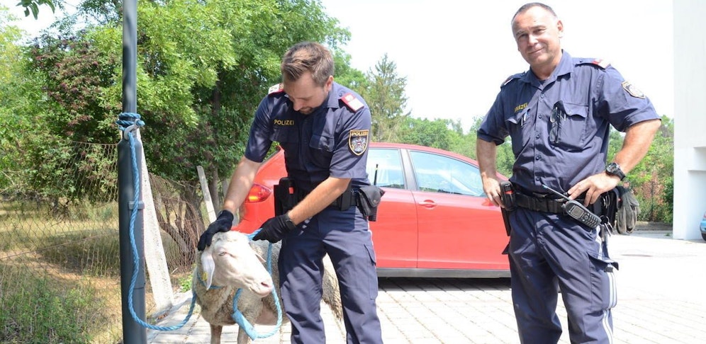 Dort sperrten sie die Bundesstraße ab und versuchten das Schaf einzufangen. Dieses ergriff jedoch die Flucht auf das Gelände einer Wohnhausanlage. Die beiden Beamten nahmen sofort die Verfolgung des „Flüchtigen" auf. Schließlich gelang es nach mehreren Versuchen Gruppeninspektor Mario P., mit einem Sprung das Schaf einzufangen und festzuhalten, während sein Kollege „den Flüchtigen" mit einem Abschleppseil sicherte und beruhigte.