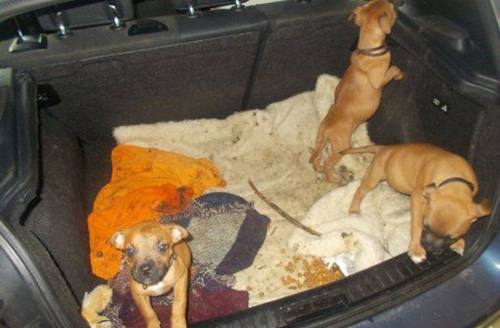 Rettung in letzter Minute: Ohne Wasser, völlig verwahrlost und im Auto eingesperrt befanden sich diese drei Kampfhunde-Welpen. Ein aufmerksamer Zeuge informierte die Polizei in München.