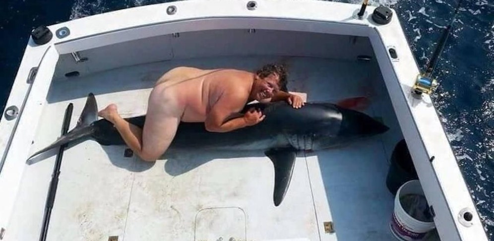 Auf dem Bild zu sehen: Ein Mann, vermutlich Angler, der sich in einem Boot an einen toten Hai klammert. "Respektlos" und "ekelhaft", finden das Tierschützer. Und wollen herausfinden, wer das freche Nackerpatzl ist.
