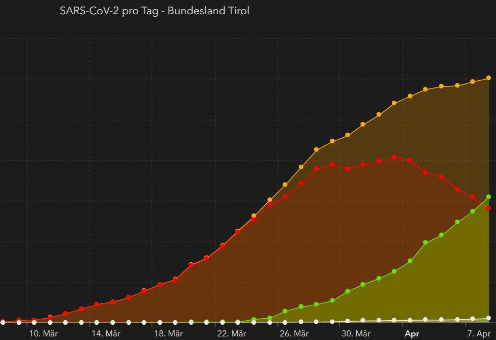 Mit Stand 8. April, 18.30 Uhr gelten in Tirol 1.552 Personen als Genesen, 1.403 als aktiv positiv. 54 Menschen überlebten die Infektion mit dem Coronavirus den offiziellen Angaben zufolge nicht. Dieser Abwärtstrend wird seit dem Maximum am 2. April verzeichnet, bisher waren aber die noch kranken Patienten deutlich in der Überzahl. Mit Mittwoch hat sich das Verhältnis zu den Genesenen aber erstmals umgekehrt – Tirol scheint über den Berg.