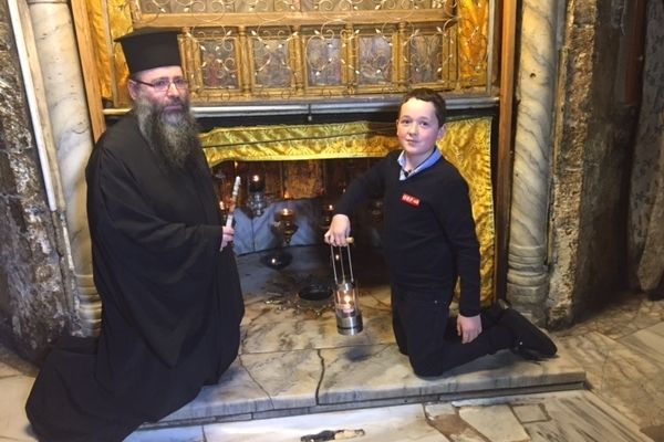 In der Geburtsgrotte in Bethlehem hat der 12-jährige Tobias das Friedenslicht gemeinsam mit einem Pater entzündet.