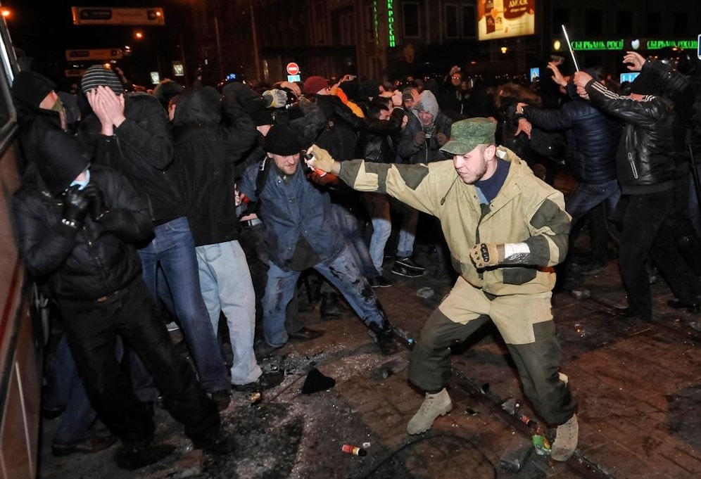Am Abend hatten sich in Donezk rund tausend Anhänger der proeuropäischen Übergangsregierung in Kiew versammelt, um gegen eine Aufspaltung des Landes zu demonstrieren, daraufhin tauchten doppelt so viele Anhänger einer Annäherung an Moskau auf. Einigen von ihnen gelang es, die Polizeikette zu durchbrechen. Bei dem darauf folgenden Handgemenge wurde der 22-jährige Demonstrant erstochen, wie die Rettungskräfte mitteilten.