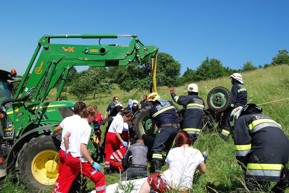 Der Fahrer wurde unter seinem Traktor eingeklemmt und konnte sich nicht selbständig befreien. Bevor der anwesende Notarzt den Patienten stabilisieren konnte, musste die verunfallte Landmaschine mit einem Seil und einem zweiten Traktor gesichert werden.