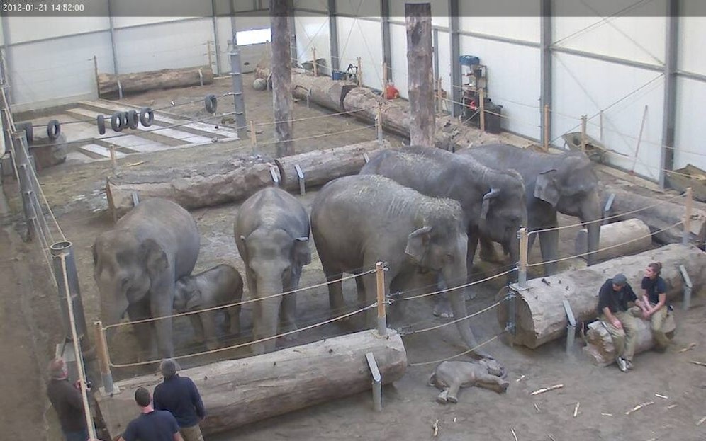 Den Pflegern blieb nicht anderes übrig, als die tote Lola nach Hellabronn zurückzubringen, damit sich ihre Familie von ihr verabschieden konnte. Panang, Ludwig, Temi, Mangala, Tina und Steffi (Foto oben, v.l.n.r.) beschnupperten, was einen Tag vorher noch ihr jüngstes Familienmitglied gewesen war. Auch die Pfleger mussten die Tränen zurückhalten, als die restliche Elefantenfamilie zum letzten Mal ihr Baby sah.