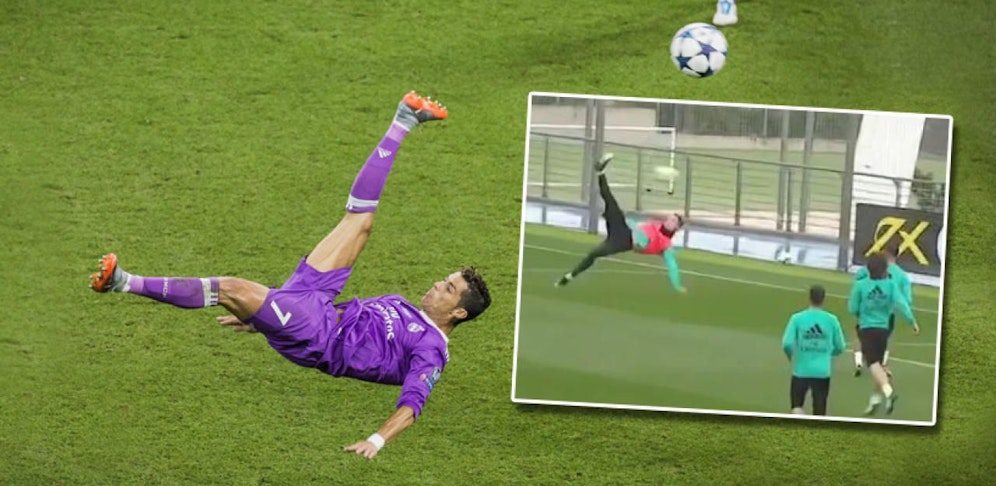 Cristiano Ronaldo hat es schon wieder getan. Nur wenige Tage nach seinem traumhaften Fallrückzieher-Tor in der Königsklasse gegen Juventus, das die gesamte Fußball-Welt verzückte, legte der Portugiese beim Real-Training den nächsten Fallrückzieher nach.