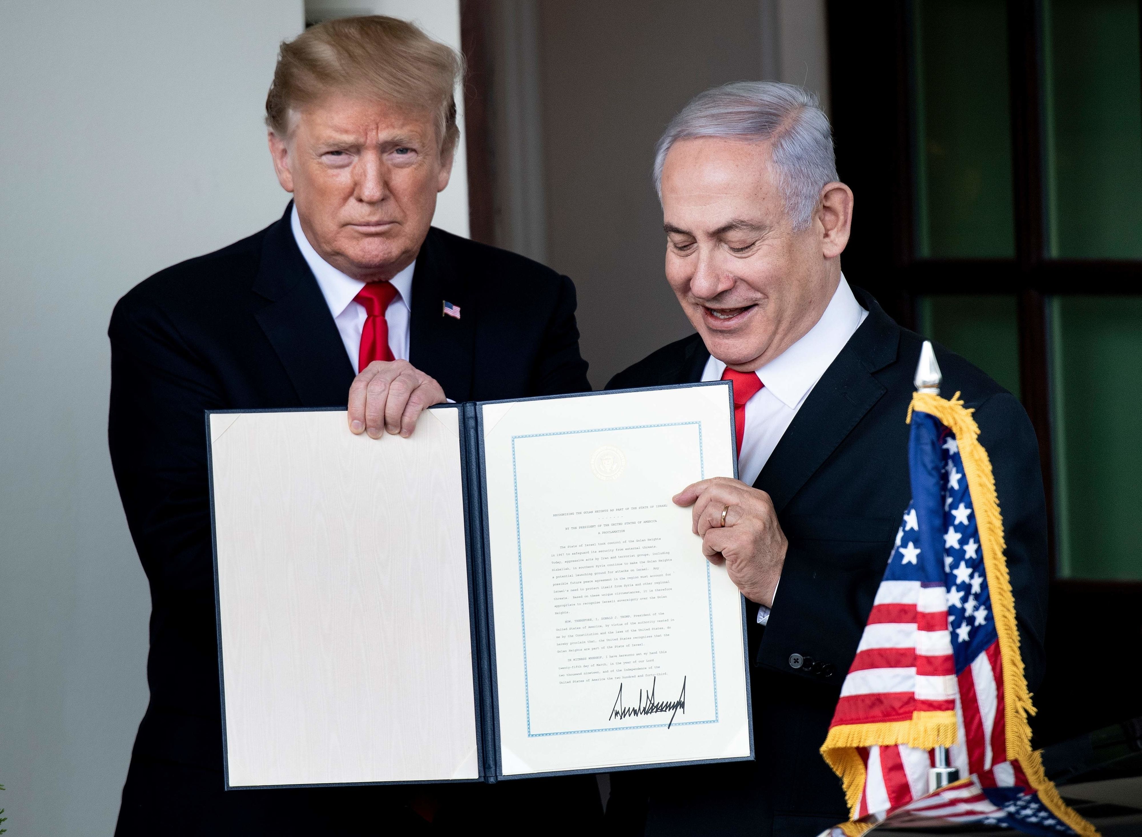 US-Präsident Donald Trump und Israels Premierminister Benjamin Netanjahu mit der eben unterzeichneten Golan-Höhen-Proklamation. (Quelle: picturedesk.com/AFP/Brendan Smialowski)