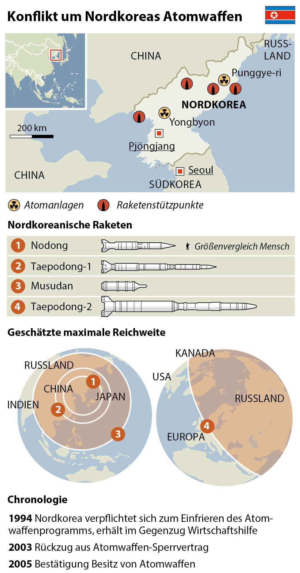 2003 Nordkorea tritt aus dem Atomwaffensperrvertrag aus, bekennt sich 2005 zum Besitz von Atomwaffen. 2006 testet Pjönjang mehrere Raketen über dem Japanischen Meer, nur kurz später folgt der erste unterirdische Atomtest.