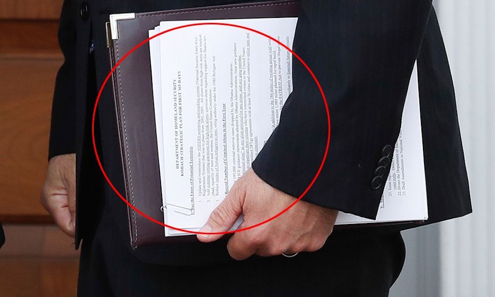Er trug ein Geheimdokument für alle sichtbar außerhalb seiner Aktentasche in der Hand. Die US-Nachrichtenseite "Politico" hat entziffert, worum es sich handelt. "Kobachs Strategischer Plan für die ersten 365 Tage" steht darauf. Die Mauer zu Mexiko, beispielsweise, soll "sehr schnell" gebaut werden.