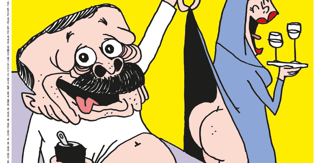 Die Karikatur auf der Titelseite der Mittwochausgabe von «Charlie Hebdo», die am Dienstagabend schon online veröffentlicht wurde, zeigt Erdogan in weißem Oberteil und Unterhose auf einem Sessel sitzend. Er hält eine Dose in der Hand und hebt das Gewand einer verschleierten Frau hoch, um ihr nacktes Hinterteil zu enthüllen. "Ohh! Der Prophet!", heißt es dazu in einer Sprechblase. Die Seite ist betitelt mit den Worten: "Erdogan – privat ist er sehr lustig".
