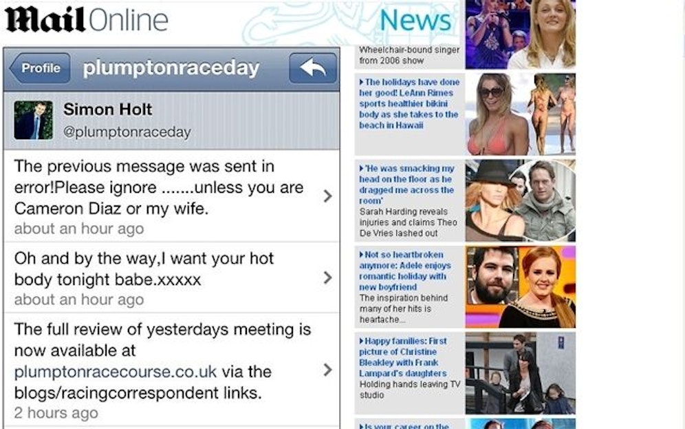 Der englische Moderator Simon Holt twittert regelmäßig Pferde-Renn-Updates für Wettbegeisterte. Doch was den Sportfans da per Twitter ins Haus flatterte, hätten sie nicht erwartet. "Ich will deinen heißen Körper heute Nacht", ließ Holt per Internet verlauten.