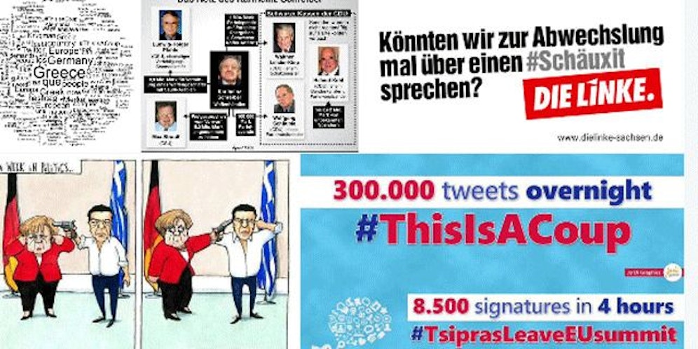 Twitter-Nutzer solidarisieren sich mit Griechenland – und zürnen gegen Kanzlerin Angela Merkel und Finanzminister Wolfgang Schäuble. Laut griechischem TV-Sender "Mega" sprachen griechische Regierungsmitglieder im Rahmen der Gläubiger von „monströsen“ Forderungen. Fernsehkommentatoren verglichen die Methoden der Deutschen mit "Daumenschrauben" und sie sprachen von "Demütigung" Griechenlands. Merkel und Schäuble werden zu Feindbildern stilisiert und teils mit Weltkriegsvergleichen bedacht.