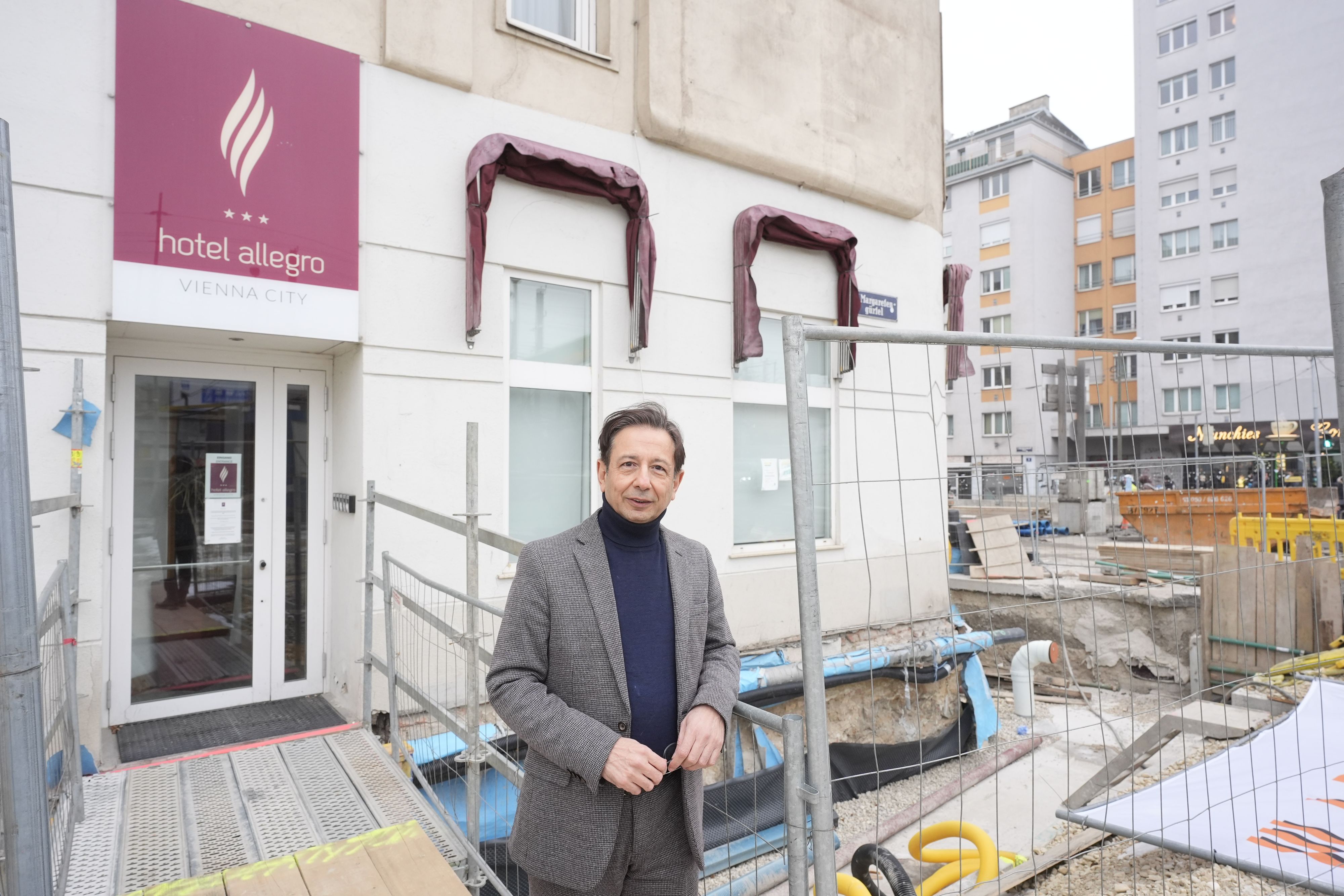Jedes Jahr übernachten rund 47.000 Gäste im Hotel "Allegro" am Matzleinsdorfer Platz (Margareten). Der Betrieb mit rund 6.000 Quadratmetern verfügt auf sechs Etagen über 71 Zimmer und sechs Appartements. 2013 übernahm Architekt und Ziviltechniker Adil Lari das Objekt – fünf Jahre später begann eine wahre Baustellen-Odyssee, die laut Wiener Linien voraussichtlich erst 2030 beendet sein wird.