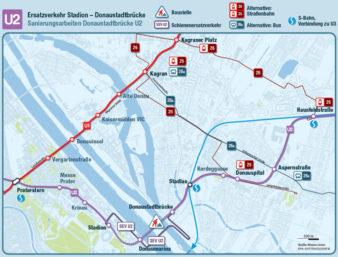 Zwischen den U2-Stationen Stadion und Donaustadtbrücke wird ein Ersatzverkehr mit Bussen eingerichtet. Es ist außerdem möglich, mit den Linien 25, 26, 26A sowie der S-Bahn-Linie S80 großräumig auszuweichen. Die Linien 25, 26 und 26A bieten aus der Donaustadt eine Anbindung an die U1, mit der Fahrgäste rasch weiter zum Praterstern bzw. in die Innenstadt kommen.