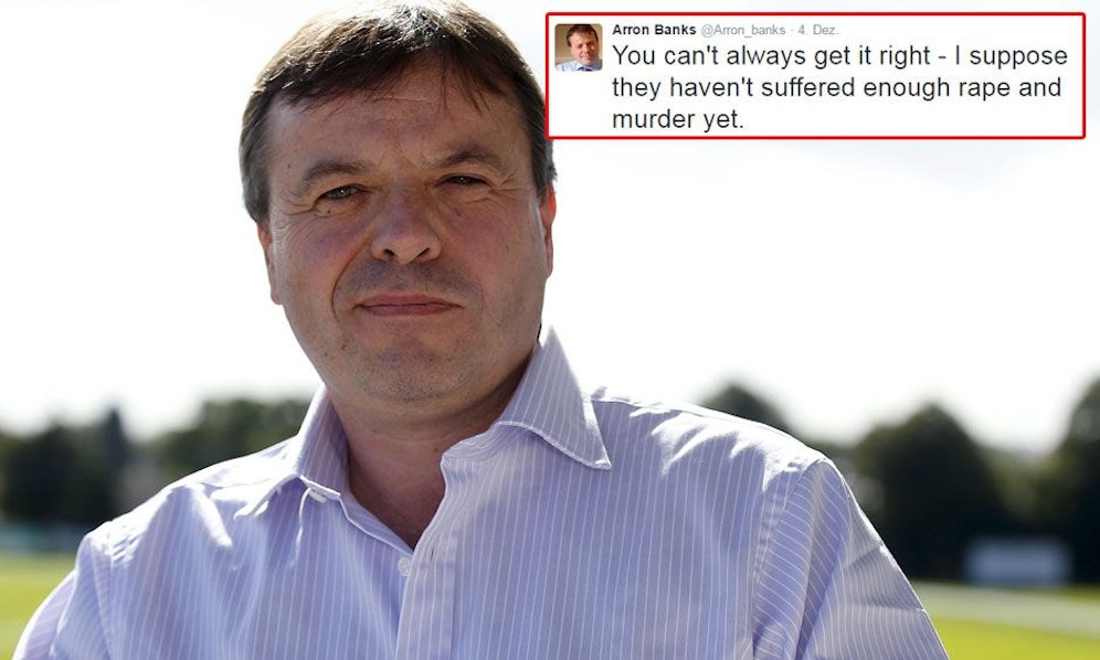 "Man kriegt es nicht immer gut hin - ich nehme an, dass sie (die Österreicher, Anm.) noch nicht genug Vergewaltigungen und Morde erlitten haben", schrieb Banks auf Twitter als Reaktion auf die den Wahlausgang in Österreich. 50 Prozent der Österreicher seien wütend, die andere Hälfte würde sich in die Tasche lügen, sagt der Farage-Vertraute und bekennende Anti-EU-Aktivist.