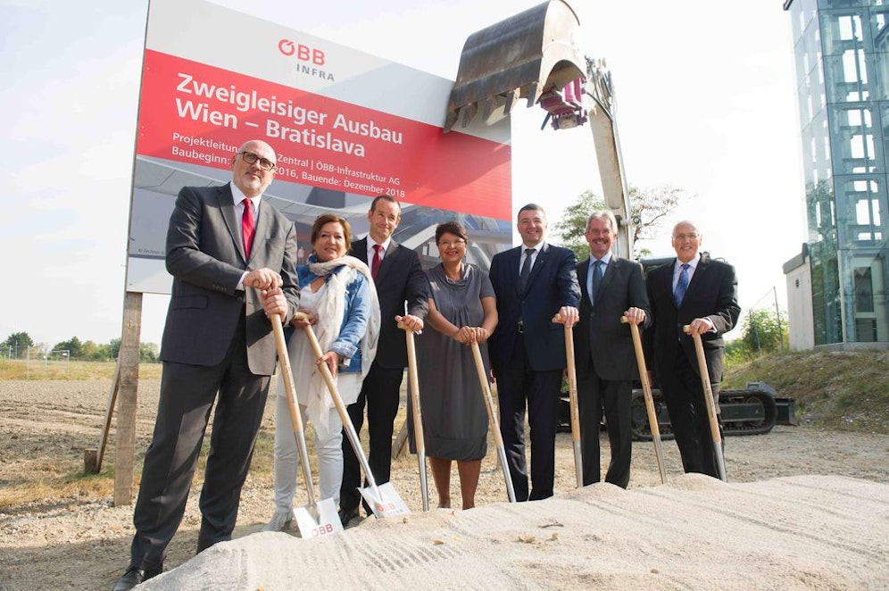 Infrastrukturminister Jörg Leichtfried, Stadträtin Renate Brauner, Niederösterreichs Landesrat Karl Wilfing und ÖBB-Chef Andreas Matthä läuteten heute bei einem gemeinsamen Spatenstich den Baustart offiziell ein. Für die Modernisierung der Strecke investieren die ÖBB 505 Millionen Euro.
