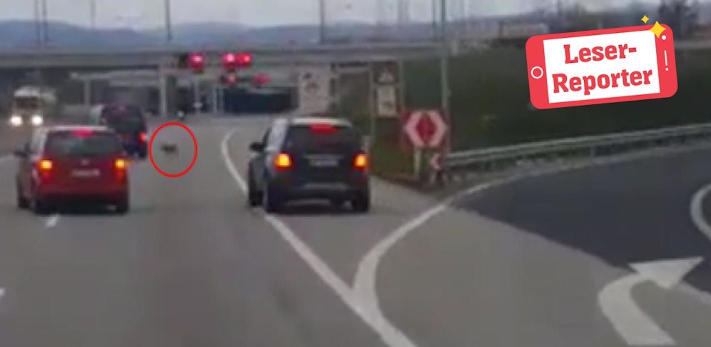 Orientierungslos lief er quer über alle drei Fahrspuren. Mit eingezogenem Schwanz zischte der Hund sichtlich verängstigt hin und her.