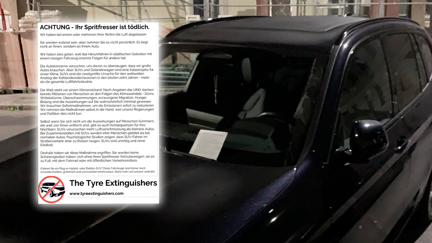 "ACHTUNG – Ihr Spritfresser ist tödlich." Mit dieser Nachricht auf der Windschutzscheibe fanden viele Wiener Auto-Besitzer ihr Fahrzeug am Donnerstagmorgen vor. Unbekannte haben aus einem oder mehreren Reifen die Luft ausgelassen. "Luftnot Kollektiv" nennen sich die Verantwortlichen in einem Bekennerschreiben.