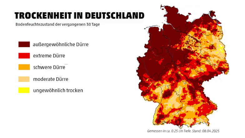 Laut dem Deutschen Wetterdienst (DWD) sind im vergangenen März nur 21 Prozent des sonst üblichen Regens gefallen. Die Folge: Es ist extrem trocken, die Böden sind hart und staubig. Der heurige März war in Deutschland zudem einer der wärmsten seit Beginn der Wetteraufzeichnungen.