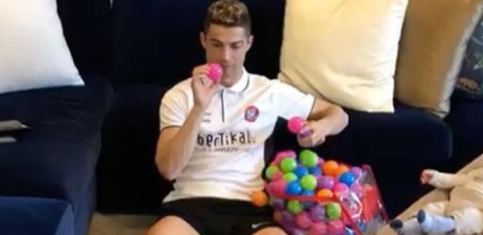 Der Portugiese schnappte sich einen einen Sack bunter Bälle, der eigentlich für seine Baby-Tochter Alana gedacht wäre und versuchte diese in einem Wasserglas zu versenken. Böse Zungen behaupten, dass er sich dabei genauso ungeschickt angestellt hat, wie in der aktuellen Saison beim Tor-Abschluss.
