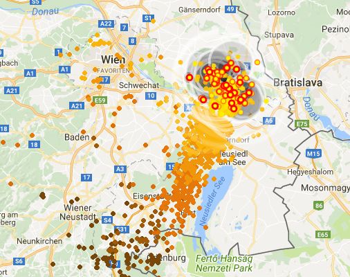 Das Blitzradar zeigte gegen 14.45 Uhr, wie die mächtige Gewitterzelle am Westufer des Neusiedler Sees nach Norden zog: