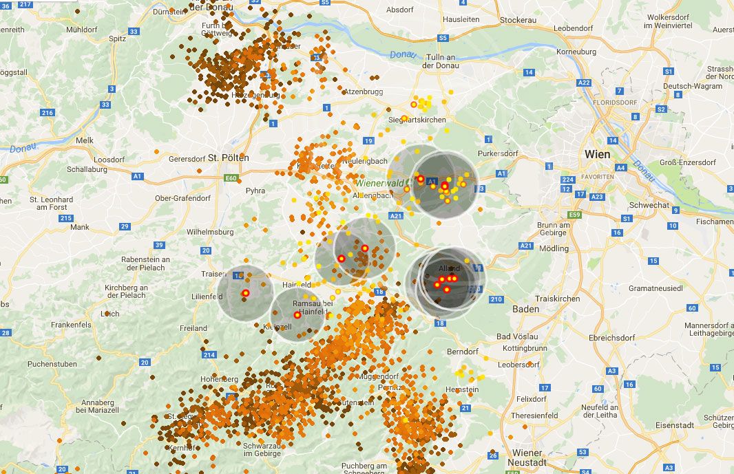 Gegen 16.30 Uhr wurden heftige Blitzschläge bei Pressbaum verzeichnet. Die Unwetterzelle hatte sich in Richtung Perchtoldsdorf und Wien-Liesing weitergeschoben und war mit einem weiteren Gewitter-Hotspot verschmolzen. Zwischen Sulz im Wienerwald und Guntramsdorf blitzte und donnerte es beinahe im Sekundentakt.