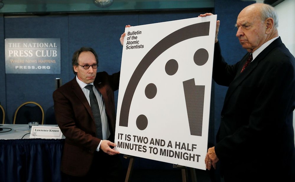 Glaubt man der sogenannten "Doomsday Clock", stand die Menschheit seit 1953 nicht mehr so nahe am Ende wie heute. Wissenschaftler stellten ihren Zeiger von 23.57 Uhr um 30 Sekunden vor.