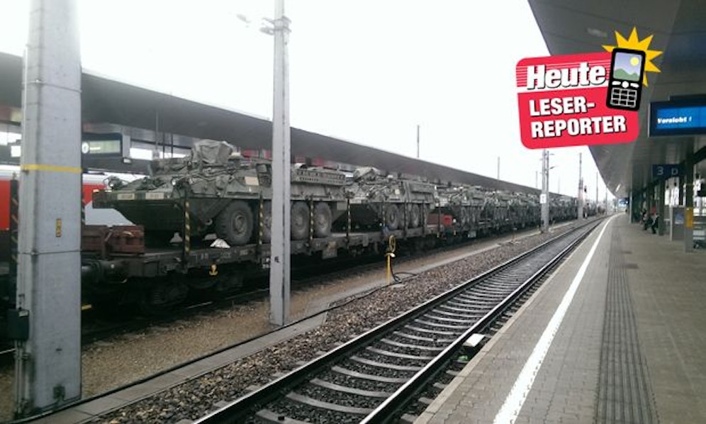 Am Dienstagmorgen konnten die Pendler am Bahnhof St. Pölten eine spannende Beobachtung machen. Ein mit Panzern der US-Armee beladener Güterzug fuhr um etwa 06.10 Uhr auf Gleis 2 durch den Bahnhof. Die Radpanzer waren von Rumänien nach Deutschland unterwegs.